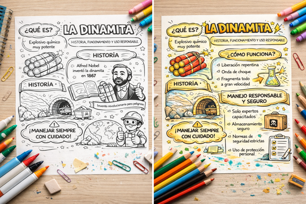 🚀 Esta hoja de colorear nos invita a descubrir la historia de la dinamita, su funcionamiento básico y la importancia de su manejo seguro.