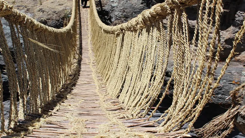El Puente Q’eswachaka en Perú (de fibra de ichu) sigue siendo reconstruido cada año por comunidades locales, como lo hacían sus ancestros.